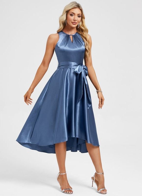 Cette magnifique robe bleu élégant chic transforme chaque apparition en moment d'exception. Conçue dans un satin luxueux qui épouse délicatement vos courbes, elle révèle une silhouette trapèze intemporelle rehaussée par un col rond sophistiqué et une découpe asymétrique qui apporte une touche contemporaine. Le tissu satiné capture la lumière avec subtilité, créant des reflets changeants qui subliment votre teint. Son design sans manches met en valeur vos épaules tandis que la ceinture intégrée dessine une taille marquée pour un effet sculptant immédiat. Cette pièce d'exception allie confort et raffinement grâce à sa doublure complète qui assure une tenue parfaite tout au long de vos événements les plus précieux.