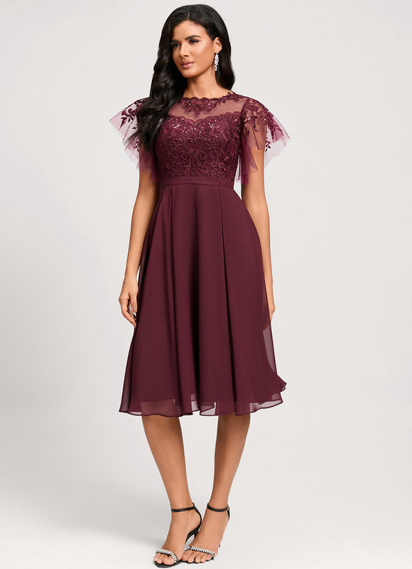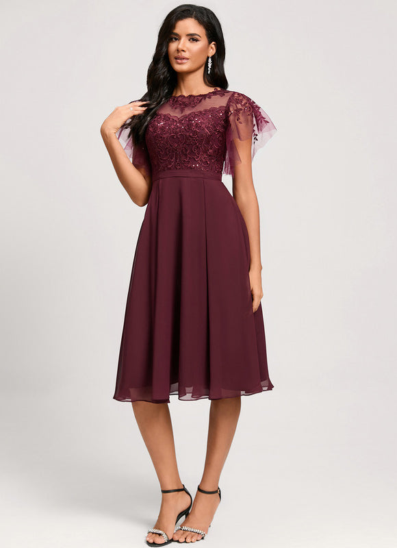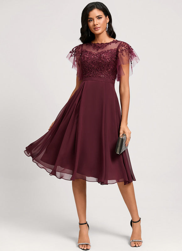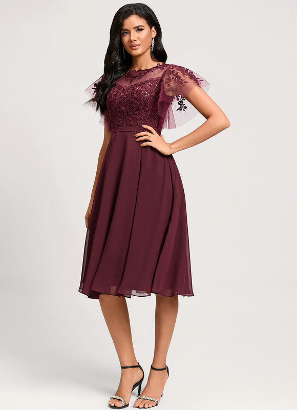 Laissez-vous séduire par cette magnifique robe bordeaux évanescent qui incarne parfaitement l'alliance entre sophistication et féminité. Cette pièce d'exception transformera instantanément votre silhouette grâce à sa coupe trapèze flatteuse qui s'évase délicatement à partir de la taille. Le tissu mousseline fluide caresse votre peau tout en créant un mouvement gracieux à chaque pas. Son col illusion orné de paillettes scintillantes apporte une touche de glamour subtile, parfait pour briller lors de vos événements les plus importants. Cette robe midi d'une longueur idéale s'arrête élégamment sous le genou, créant une silhouette raffinée qui convient aussi bien aux mariages qu'aux cocktails ou soirées d'entreprise.