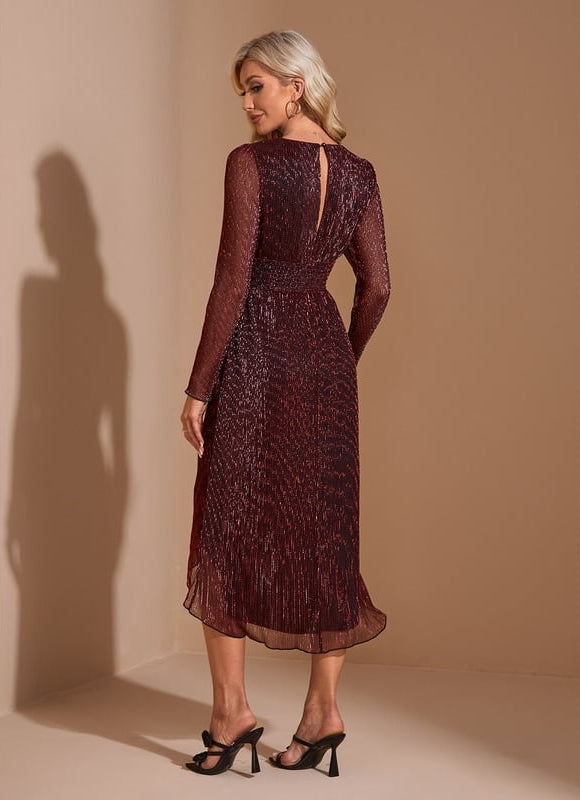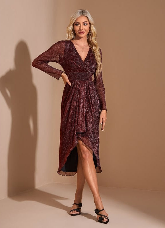 Laissez-vous séduire par cette magnifique robe bourgogne lumineuse qui capture parfaitement l'essence de l'élégance moderne. Confectionnée dans un sublime tulle aux reflets chatoyants, cette robe trapèze au décolleté en V flatteur vous offre un look irrésistible pour toutes vos occasions spéciales. Sa longueur asymétrique apporte une touche contemporaine tandis que la coupe portefeuille souligne délicatement votre silhouette. Les manches longues ajoutent une note de sophistication, parfaite pour les saisons automne-hiver. Grâce à sa taille élastique et son tissu extensible, vous bénéficierez d'un confort optimal tout en affichant une allure distinguée qui ne passera pas inaperçue.