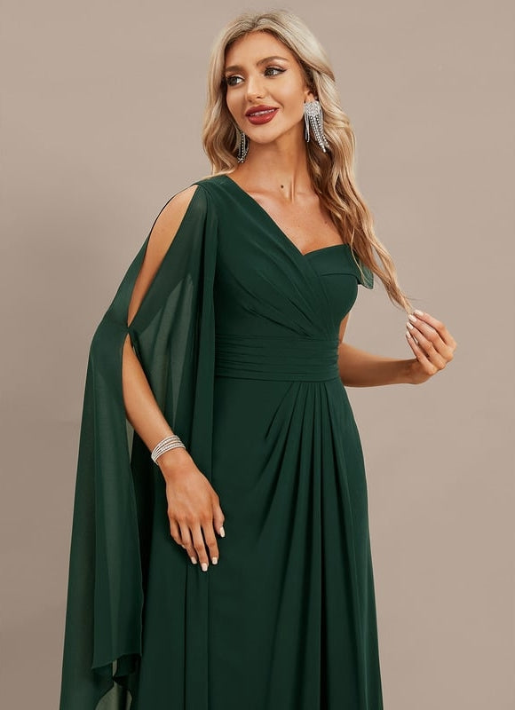 Le secret de cette robe Col Évasé Élégance réside dans sa coupe fourreau impeccablement ajustée qui sculpte votre silhouette avec expertise. La mousseline plissée au niveau du buste crée un drapé naturel qui flatte toutes les morphologies, tandis que la fermeture zip arrière assure un tombé parfait. Les manches cape asymétriques, véritable signature de cette pièce d'exception, apportent un mouvement théâtral à chacun de vos gestes. Cette robe longue Col Évasé Élégance se distingue par ses détails sophistiqués : un soutien-gorge intégré pour un maintien optimal sans armatures, garantissant votre confort tout au long de la soirée. La couleur vert émeraude profonde évoque la richesse et l'élégance intemporelle, créant un contraste saisissant avec tous les types de carnation.