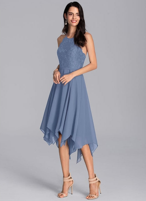 Découvrez cette magnifique robe de soirée courte devant et longue derrière qui redéfinit l'élégance moderne. Conçue dans un superbe ton bleu poudré, cette pièce exceptionnelle associe un corsage raffiné en dentelle délicate à une jupe fluide en mousseline qui danse au gré de vos mouvements. Sa coupe trapèze flatteuse et son col licou sophistiqué créent une silhouette irrésistible qui vous fera rayonner lors de toutes vos occasions spéciales. L'ourlet asymétrique en forme de mouchoir apporte cette touche d'originalité qui fait toute la différence, vous permettant de révéler subtilement vos jambes tout en conservant une allure distinguée.