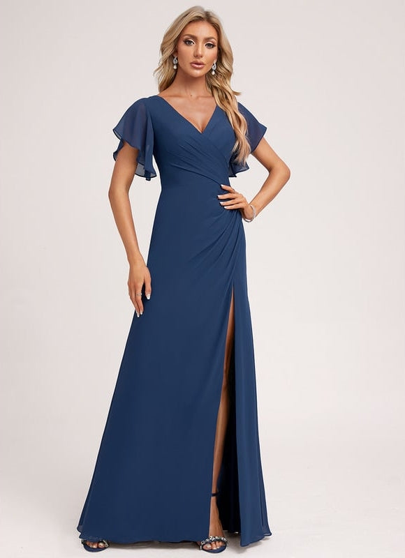 Découvrez cette magnifique robe longue Danse De Soie qui incarne parfaitement l'alliance entre sophistication et féminité. Confectionnée dans une mousseline fluide d'un bleu marine profond, cette robe trapèze vous enveloppe d'une élégance naturelle. Son décolleté en V sublimement travaillé et ses manches courtes à volants apportent une touche romantique irrésistible. La fente latérale révèle subtilement votre jambe à chaque pas, créant un mouvement gracieux qui évoque une véritable danse de soie. Cette pièce d'exception transformera chaque occasion en moment mémorable, que ce soit pour un mariage, une soirée cocktail ou tout événement qui mérite votre plus belle allure.