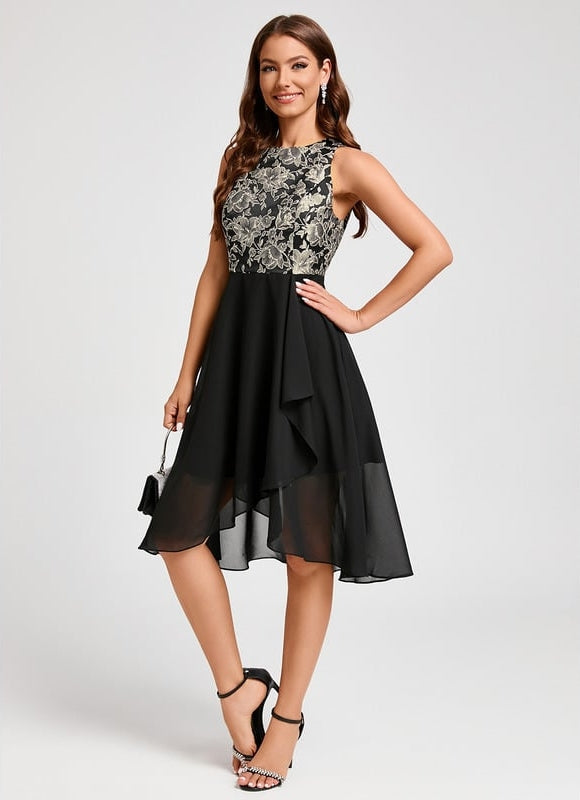 Le génie de cette robe éclatante noir réside dans ses détails minutieusement pensés. Le col rond met en valeur votre décolleté avec subtilité, tandis que la coupe sans manches libère vos mouvements tout en conservant une ligne pure et intemporelle. La particularité de cette création se trouve dans sa jupe asymétrique qui crée un jeu de longueurs captivant : plus courte devant pour dévoiler vos jambes avec élégance, elle s'allonge vers l'arrière pour un effet dramatique saisissant. La mousseline semi-transparente de la partie basse ajoute une dimension sensuelle sans jamais tomber dans la vulgarité, faisant de cette robe éclatante noir un véritable chef-d'œuvre de la couture contemporaine.