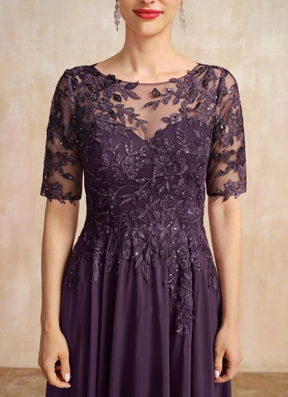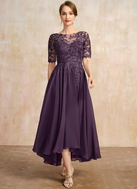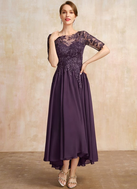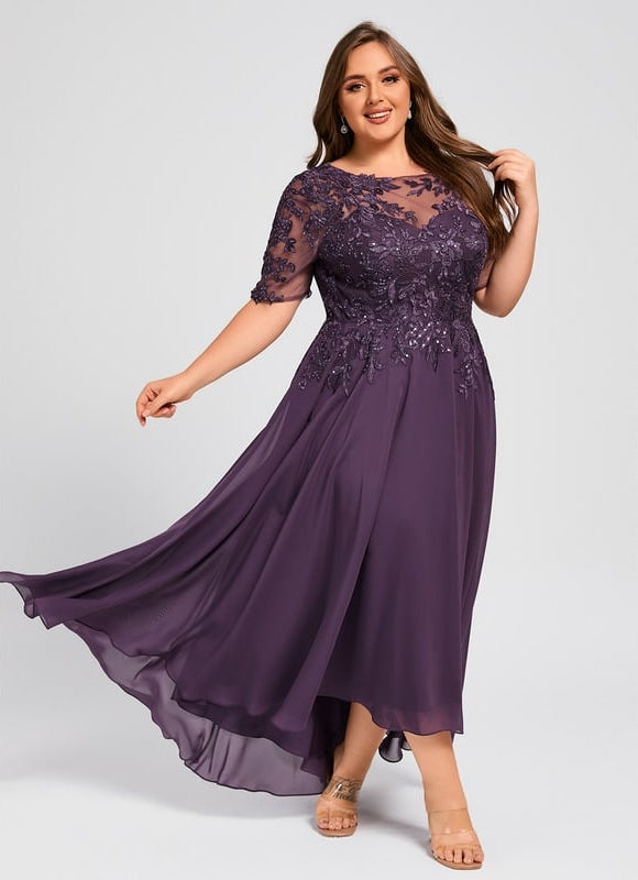 Cette magnifique robe Élégance Ondoyante en mousseline violette capture l'essence même de la sophistication moderne. Sa silhouette trapèze sublimement asymétrique épouse délicatement vos courbes avant de danser autour de vos jambes à chaque pas. Le corsage orné de dentelle délicate et de paillettes scintillantes crée un jeu de transparence raffiné qui révèle juste ce qu'il faut de peau. Avec ses manches courtes en illusion et son col rond féminin, cette robe transforme chaque occasion en moment d'exception. La coupe asymétrique apporte une touche contemporaine à ce design intemporel, tandis que la doublure intégrée avec soutien-gorge vous assure un confort optimal toute la journée.