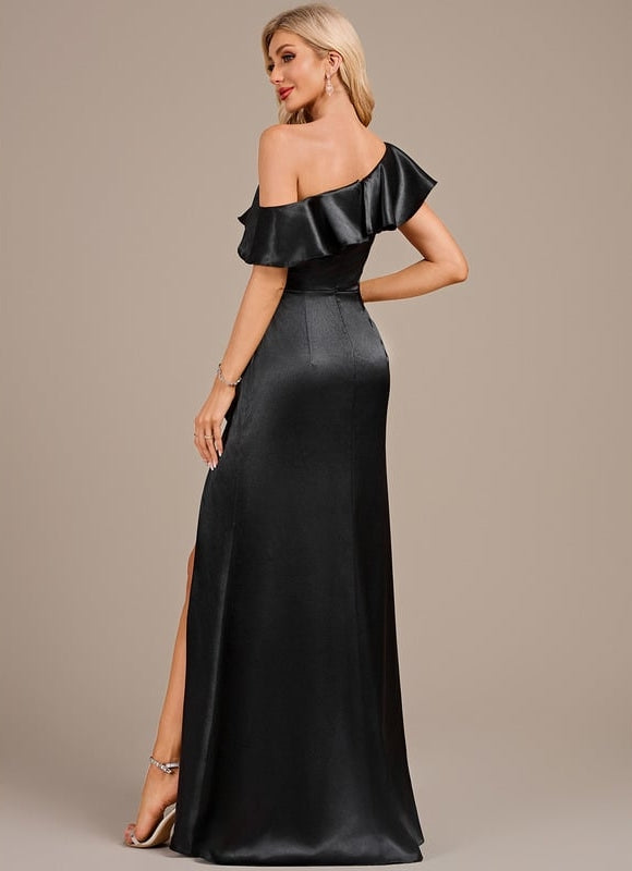Plongez dans un univers de sophistication avec cette magnifique robe longue qui incarne parfaitement l'élégance sombre. Confectionnée dans un satin luxueux d'un noir profond, cette pièce exceptionnelle transforme chaque apparition en moment inoubliable. Sa coupe fourreau épouse délicatement vos courbes tandis que le col asymétrique apporte une touche de modernité audacieuse. Les volants romantiques qui ornent l'encolure et la fente latérale créent un jeu de contrastes saisissant entre sensualité et raffinement. Cette robe n'est pas simplement un vêtement, c'est une déclaration de style qui vous accompagnera lors de vos événements les plus importants.