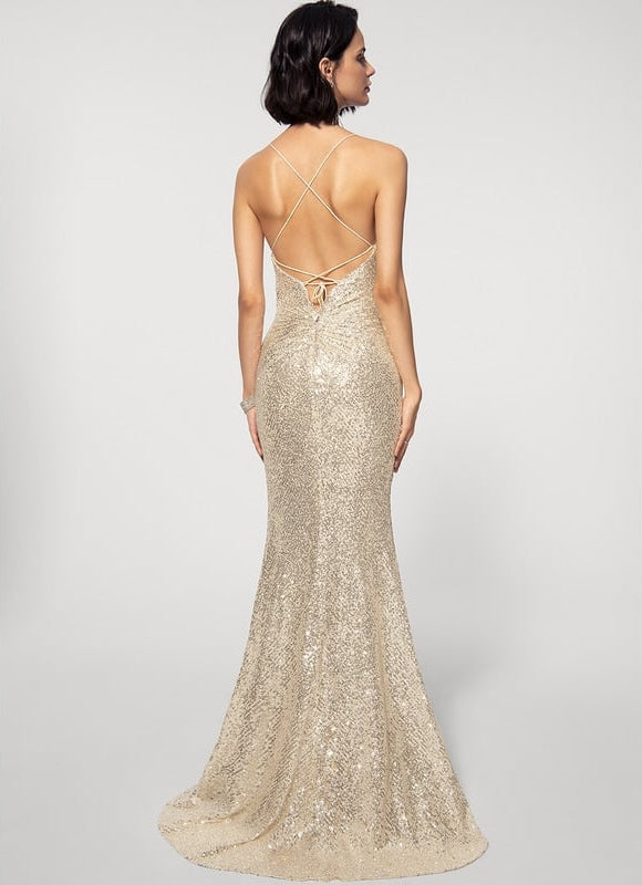 Cette robe se distingue par son tissu pailleté aux reflets dorés qui créent un effet hypnotisant sous les éclairages. Les détails plissés apportent une dimension artistique à l'ensemble, créant des jeux d'ombre et de lumière qui accentuent l'effet scintillant du glitter doré. Le col V généreux allonge la silhouette et met en valeur le décolleté, tandis que les manches longues offrent une élégance intemporelle. Le dos à bretelles révèle délicatement la peau tout en maintenant la robe parfaitement en place. Cette alliance entre le glamour des paillettes et la finesse des détails plissés fait de cette pièce un véritable bijou de garde-robe.