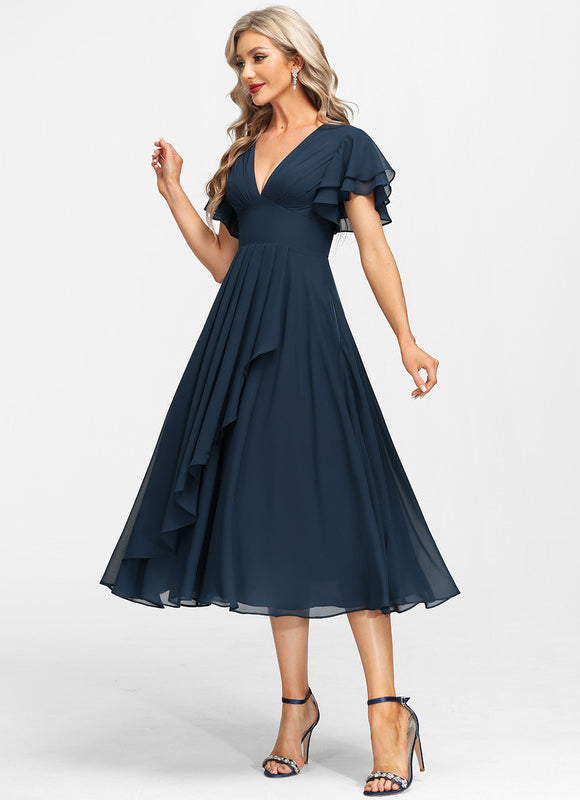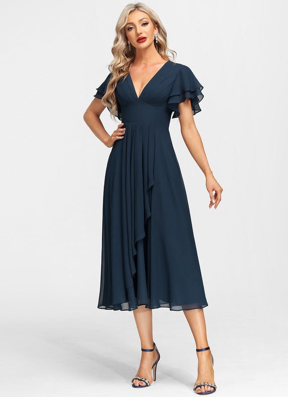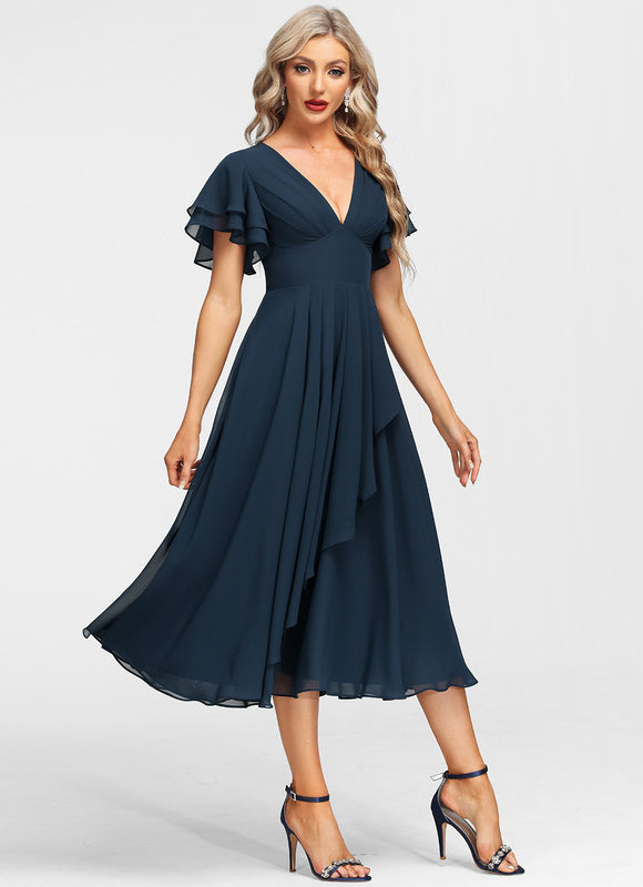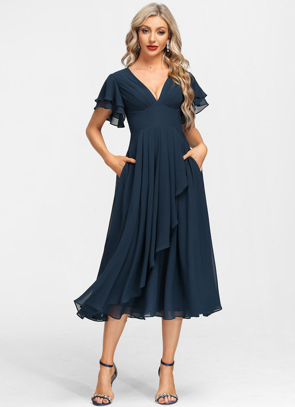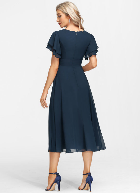 Chaque détail de cette Robe de Soirée Longue Bleue Mousseline À Volants a été pensé pour vous sublimer. Son élégant **col en V** mettra en valeur votre décolleté avec raffinement, tandis que les **volants délicats** sur les manches courtes et la jupe apportent une touche de romantisme et de dynamisme à votre démarche. Sa **forme trapèze** est universellement flatteuse, offrant une silhouette élancée et un confort inégalé, vous permettant de danser et de vous déplacer avec aisance. La **longueur midi**, à la fois chic et moderne, la rend versatile pour diverses occasions, des plus formelles aux événements plus décontractés. Et pour un confort optimal, elle intègre un **soutien-gorge** ainsi que, surprise, des **poches discrètes** – un atout pratique que vous allez adorer ! Le **dos arrondi** complète harmonieusement le design, ajoutant une touche de sophistication supplémentaire.