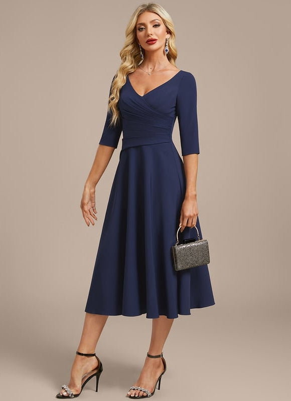 Cette magnifique robe de soirée longueur mollet incarne parfaitement l'art de l'élégance féminine. Confectionnée dans un somptueux crêpe extensible d'un bleu marine profond, elle épouse délicatement vos courbes tout en vous offrant une liberté de mouvement incomparable. Son décolleté en V subtilement plongeant et ses manches trois-quarts créent un équilibre parfait entre sophistication et sensualité. La coupe trapèze midi vous assure une silhouette flatteuse, tandis que les détails plissés à la taille sculptent votre silhouette avec une grâce naturelle. Dotée d'une doublure complète et d'un soutien-gorge intégré, cette pièce d'exception vous garantit un confort absolu tout au long de vos soirées.