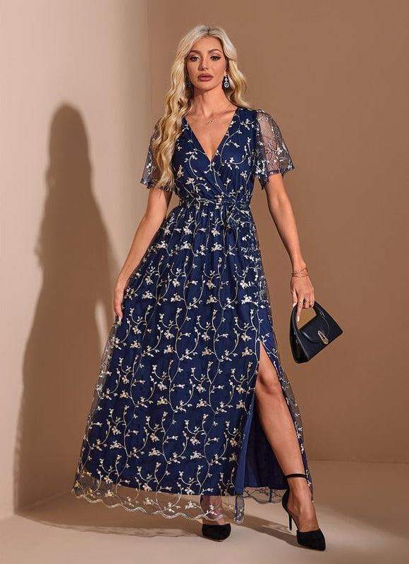 Cette magnifique robe marine florale capture l'essence de la féminité moderne avec ses broderies délicates qui dansent sur un tissu de dentelle raffiné. Sa teinte marine profonde révèle un jardin secret de petites fleurs dorées qui scintillent à chaque mouvement, créant un effet visuel captivant. La coupe trapèze flatteuse épouse naturellement vos courbes avant de s'évaser gracieusement vers le bas, offrant une silhouette élégante qui convient à toutes les morphologies. Le décolleté en V plongeant ajoute une touche de sensualité sophistiquée, tandis que les manches courtes en dentelle transparente apportent une dimension romantique irrésistible.